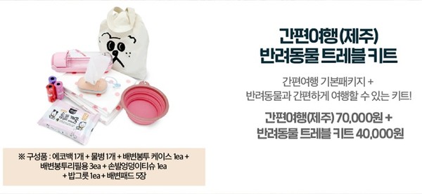 특히 반려동물 동반 여행 필수품으로 구성된 트래블 키트가 포함된 패키지도 이용 가능하다. 구성품은 에코백 1개, 물병 1개, 배변봉투 케이스 1ea, 배변봉투리필용 3ea, 손발엉덩이 티슈 1ea, 밥그릇 1ea, 배변패드 5장 등이다. 반려동물 트래블 키트는 이하넥스몰(ehanexmall.com)에서 별도 구매도 가능하다.