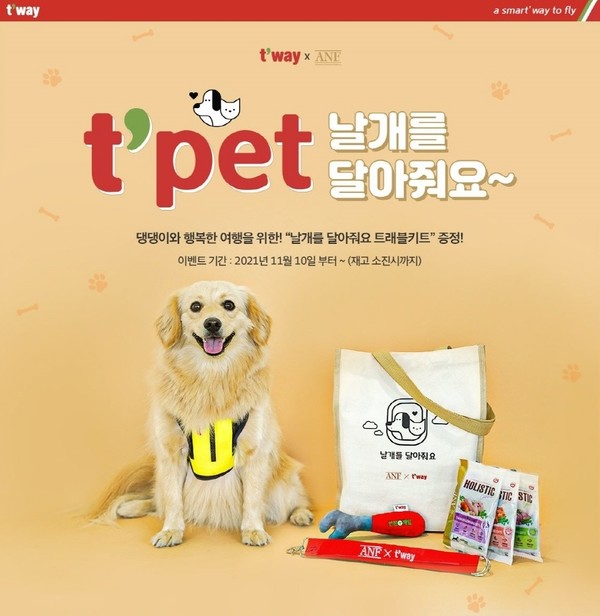 티웨이항공은 글로벌 펫푸드 업체인 ANF와 함께 반려동물 동반 탑승객을 대상으로 트래블 키트를 증정하는 ‘날개를 달아줘요’ 이벤트를 진행한다고 9일 밝혔다. 티웨이항공은 지난 5월과 8월에도 '날개를 달아줘요' 시즌 1·2를 진행한 바 있다.