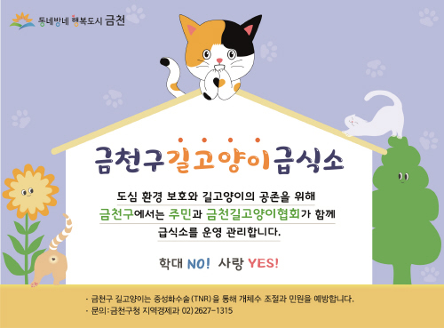 급식소 운영 관리는 주민과 금천구 길고양이 협회가 함께한다. 길고양이 협회에서 급식소 1곳당 돌봄 주민 1명을 지정하고 주민은 사료 급여, 주변 청결 관리업무를 담당하게 된다. 또한 출입 고양이 개체 수 확인 및 중성화율을 모니터링하고 금천구는 이를 토대로 중성화 수술(TNR)을 진행해 개체 수를 조절할 계획이다.