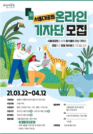 서울대공원은 블로그, 유튜브, 웹툰 등 다양한 분야의 재능을 가진 20명을 2021년 서울대공원 기자단으로 선발·운영한다고 지난 26일 밝혔다.