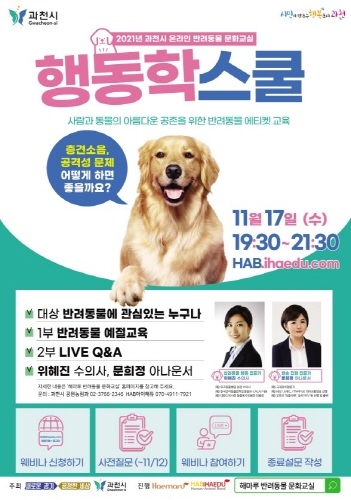 경기 과천시는 올바른 반려동물 문화 정착을 위해 오는 17일 오후 7시 30분부터 2시간 동안 온라인을 통해 반려동물 문화교육 ‘행동학 스쿨’을 운영한다고 밝혔다.