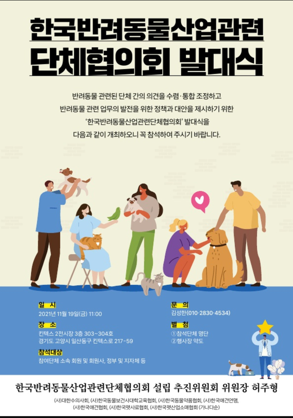 한국반려동물산업관련단체협의회 설립 추진위원회(위원장 허주형, 대한수의사회장)는 오는 19일 경기도 고양시에 위치한 일산 킨텍스 제2전시장에서 협의회 발대식을 개최한다고 10일 밝혔다.