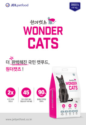 제일펫푸드 관계자는 “리뉴얼된 원더캣츠는 기호성에 영향을 주는 요소는 무엇인지에 대한 궁금증으로부터 출발해 기호성을 크게 향상시킨 것이 특징”이라며 “고양이들의 음식 섭취 행동, 후각, 식성, 단백질·수분 함량 등에 따른 기호성 등을 다각적으로 분석해 제품을 설계했다”고 설명했다.