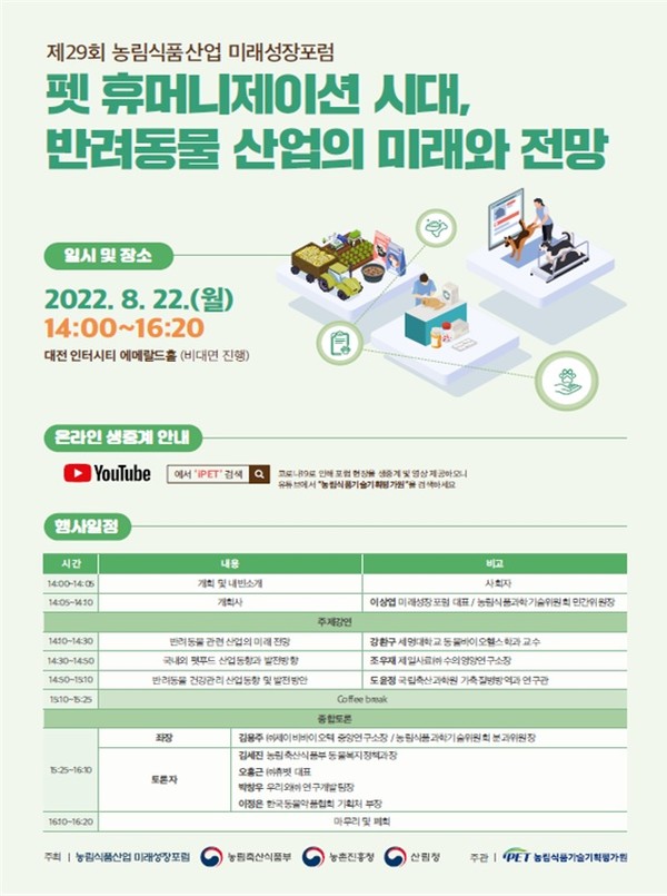 농림축산식품부·농촌진흥청·산림청이 주최하고, 농림식품기술기획평가원이 주관하는 ‘제29회 농림식품산업 미래성장포럼(이하 미래성장포럼)’이 ‘펫 휴머니제이션 시대, 반려동물 산업의 미래와 전망’을 주제로 22일 대전 인터시티 호텔 에메랄드홀에서 개최된다.