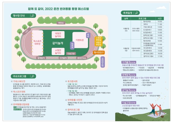 이번 행사에서는 △독스포츠 대회(원반던지기, 장애물) △코스튬 퍼레이드 △반려동물산업 포럼(시청 대회의실) △토크 콘서트 △반려동물 사진전 △체험·참여 프로그램(보물찾기, 달리기, 기다려대회, OX퀴즈 등) 등이 진행된다.