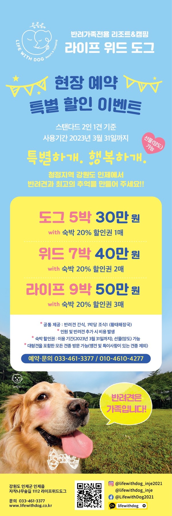 또한 청정지역 강원 인제에서 반려견과 최고의 추억을 만들 수 있도록 ‘현장 예약 특별 할인 이벤트’를 진행한다.