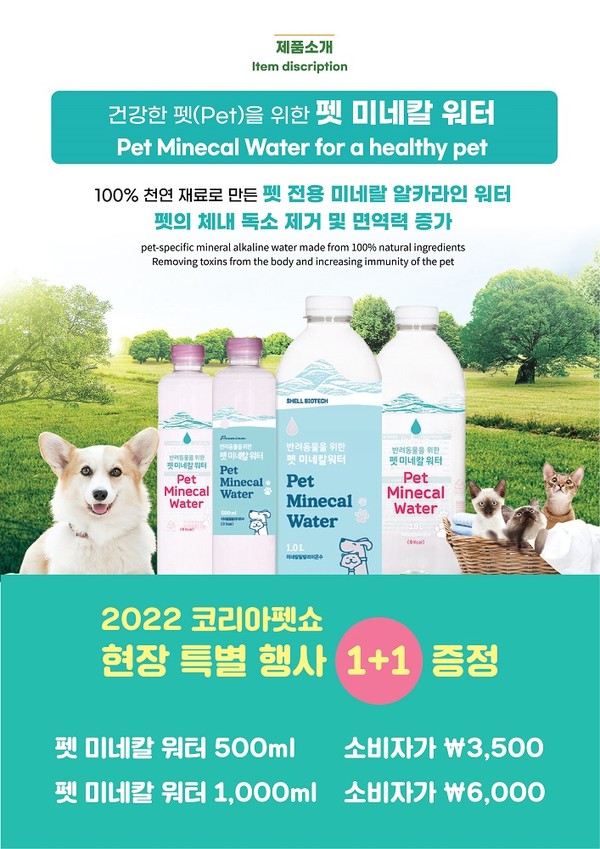 100% 천연재료로 만든 ‘펫 전용 미네랄 알카라인 워터’ 현장 특별행사도 진행한다. ‘펫 미네칼 워터’는 라이프위드도그가 농업회사법인 ㈜쉘바이오텍과 손잡고 굴 껍질을 활용해 만든 제품으로 반려동물의 체내 독소 제거 및 면역력 증가에 효과적이다.