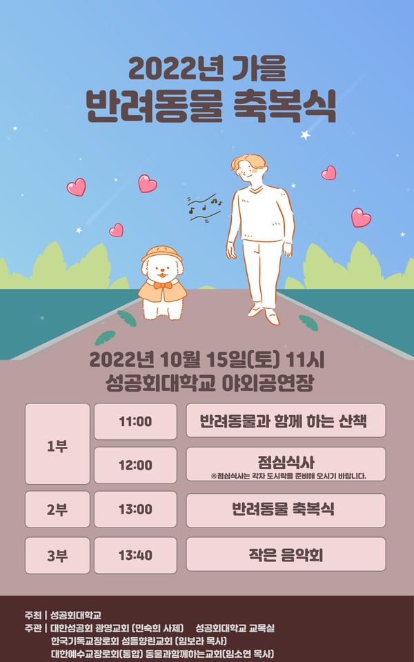 성공회대학교가 ‘2022년 가을 반려동물 축복식’을 오는 15일 오전 11시 성공회대 야외공연장에서 개최한다고 13일 밝혔다.