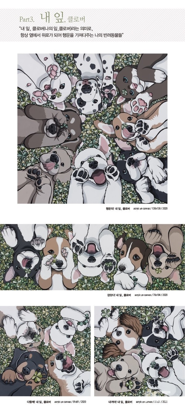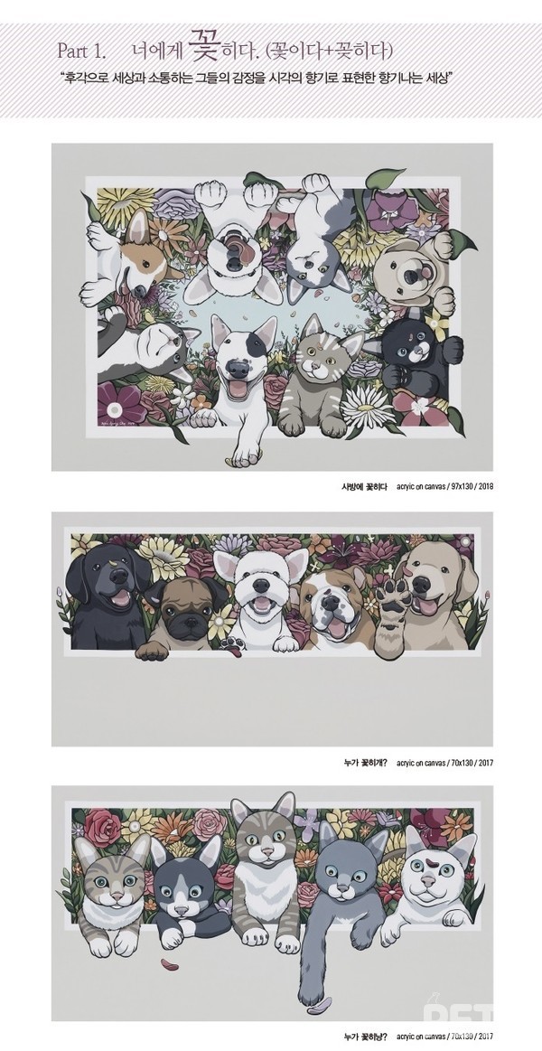 전시는 총 4가지 주제로 펼쳐진다. ▲후각으로 세상과 소통하는 반려동물의 감정을 시각적 향기로 표현한 ‘너에게 꽃히다(꽃이다+꽃히다)’ ▲가족을 만난 8마리 유기견들의 따뜻한 이야기를 담은 ‘내 개로’ ▲네잎 클로버처럼 항상 옆에서 위로가 되고 행운을 가져다주는 의미를 표현한 ‘내 잎, 클로버’ ▲관람객들의 따뜻한 손길로 완성돼 채워질 ‘우리 강아지, 내가 그려줄게!’ 아틀리에 공간이다.